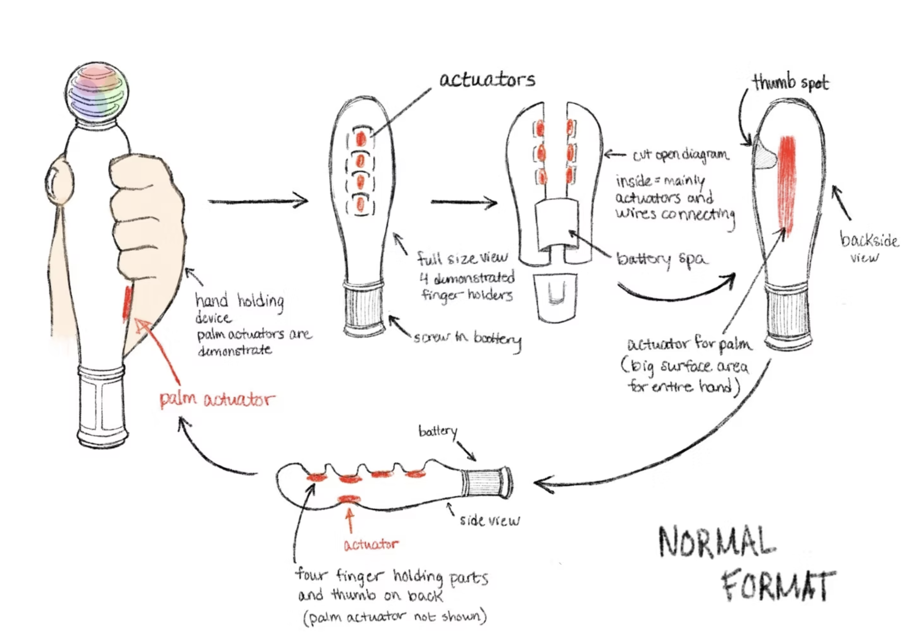 These early sketches capture my initial exploration into how vibration could translate musical elements into a physical experience. Through diagramming, ideation, and hand-drawn concepts, I mapped out actuator placements, grip ergonomics, and how tactile patterns might interact with different parts of the hand. This stage helped me visualize the internal structure and mechanics before moving into digital prototyping and user testing.